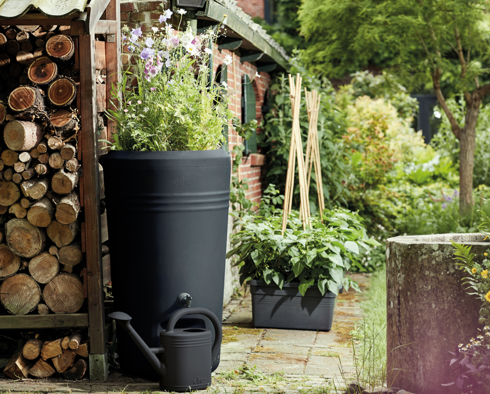 Sommige regentonnen van elho zijn multifunctioneel; met een plantenbak bovenop.