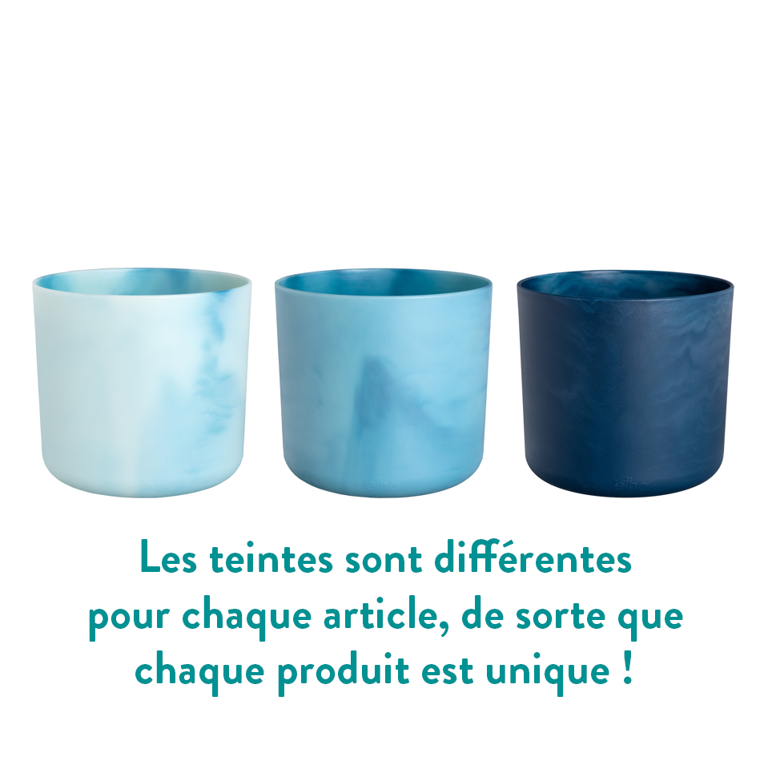 Les pots intérieurs sont disponibles en quatre tailles (14, 16, 18 et 22 cm) et en deux couleurs (atlantic blue et pacific green).
