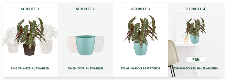 Mit diesem elho Mix and Match-Tool können Sie in 4 einfachen Schritten Ihre ganz persönlichen Pot & Plant-Kombinationen erstellen. Wenn Sie Ihr eigenes Foto hochladen, können Sie sofort sehen, wie diese Pot & Plant-Kombi bei Ihnen zu Hause aussieht.