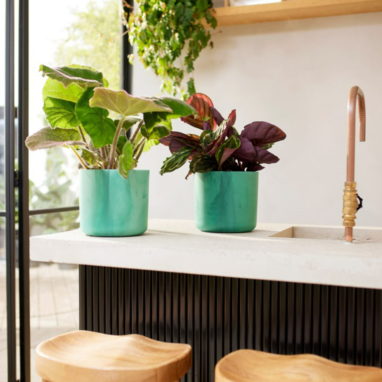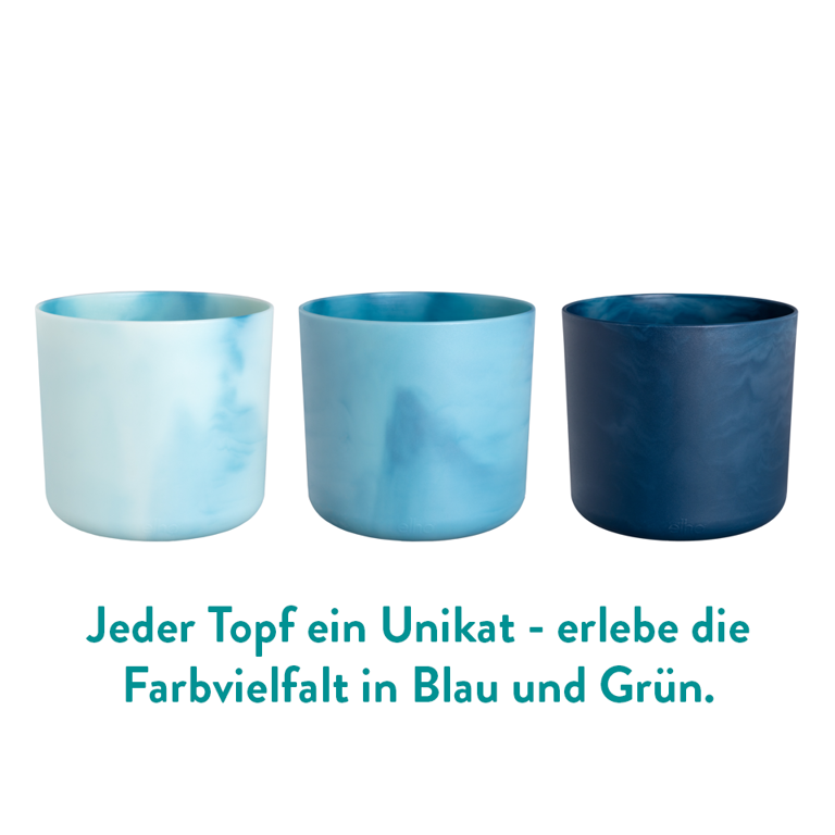 Die Blumentöpfe für den Innenbereich sind in vier Größen (14, 16, 18 und 22 cm) und zwei Farben (Atlantic Blue und Pacific Green) erhältlich.