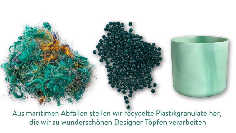 Jeder kennt die Bilder von verschmutzten Ozeanen, und der Wunsch, etwas dagegen zu unternehmen, ist groß. Ein großer Teil des Plastikmülls in den Ozeanen besteht aus Fischernetzen und Seilen, die im Meer zurückgelassen werden. Die gute Nachricht ist, dass wir einen Weg gefunden haben, dieses maritime Plastik in unserem Produktionsprozess zu verwenden, um neue einzigartige Ocean-Blumentöpfe zu kreieren. Auf diese Weise tragen wir unseren Teil dazu bei, dass diese Abfälle nicht im Meer landen.