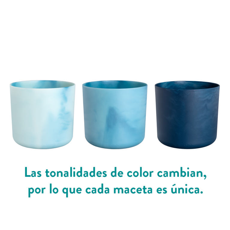 Nuestras macetas de interior están disponibles en cuatro tamaños (14, 16, 18 y 22 cm) y dos colores (azul Atlántico y verde Pacífico).