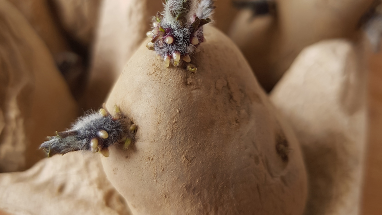 Laat de speciale pootaardappelen eerst kiemen op de vensterbank. Doe dit ca. 3 weken voordat je ze gaat poten. Laat ze kiemen op een plek waar het licht is maar niet te warm, houd ongeveer 10 graden aan. Ik kies de keuken, in de keuken is het bij mij vaak koeler dan in de woonkamer. Als de pootaardappelen op een te warme plek staan, schieten ze snel door en dat is niet de bedoeling. De scheuten moeten namelijk klein, sterk en compact blijven. Na 7 dagen zullen de ogen uit gaan lopen. Na ongeveer 3 weken zullen de scheuten groot genoeg zijn, 1 tot 2 cm, en zijn ze klaar om gepoot te worden in de potatopot.