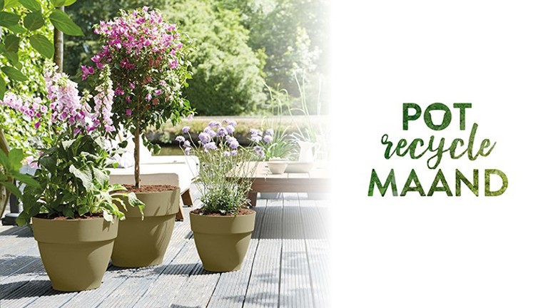 De hele maand april is het pot recycle maand. Plaats je oude plastic pot in de elho recycle bak in een intratuin filiaal en ontvang bij de servicebalie een kortingsvoucher waarmee je 15% korting krijgt op een nieuwe elho pot naar keuze. De oude plastic pot die je inlevert mag van elk merk zijn, maar lever alleen plastic potten in zonder planten of aarde. Wij zorgen er samen met Intratuin voor dat de potten op de juiste manier gerecycled worden.