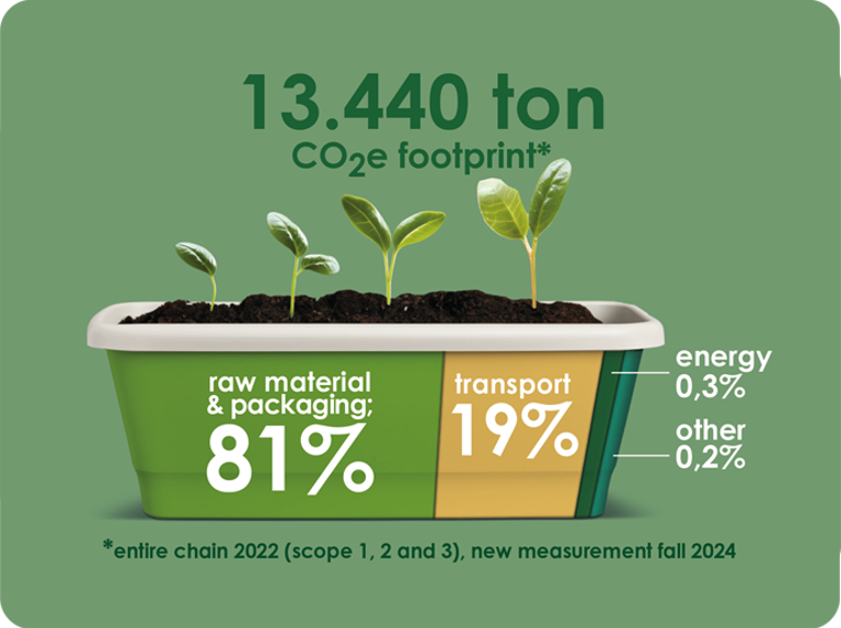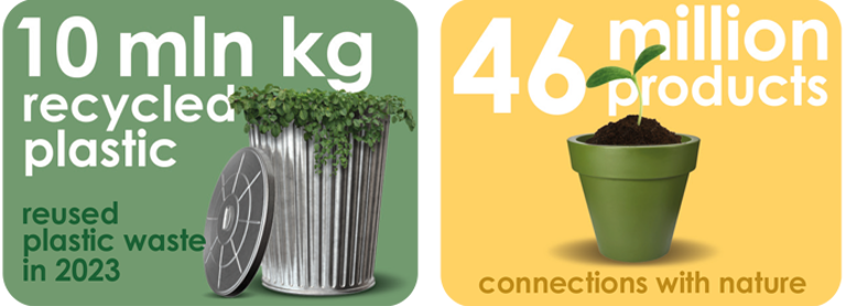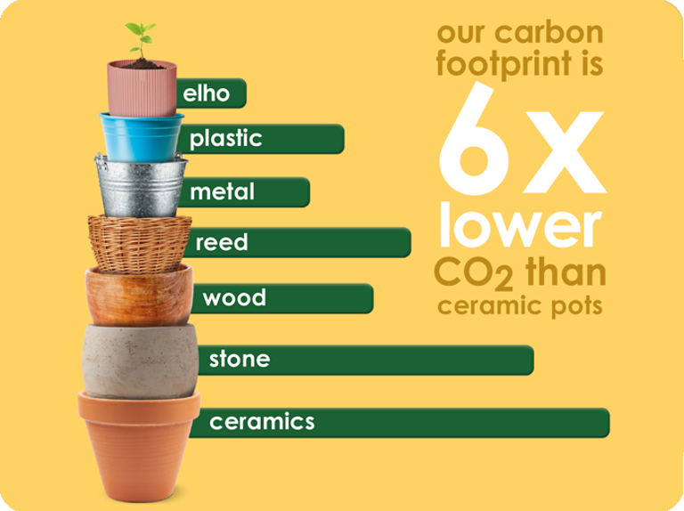 In 2025 we want to be a net positive company. We want to give more back than we take from our planet & society. One of the first steps we are going to take is to make sure that we have in 2025 zero CO2 emission. Every year we work on initiatives to lower our footprint. Thanks to local production, use of 100% recycled material, 100% recyclability, limited water and renewable energy our carbon footprint is 2,5 times lower than non-sustainable plastic pots and 6 times lower than ceramic pots.