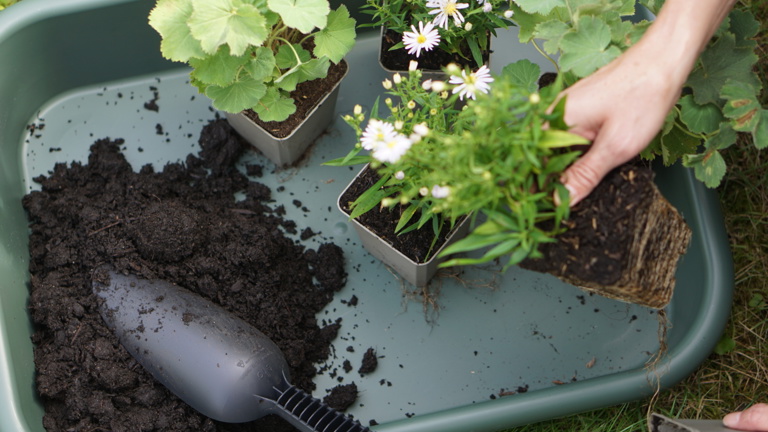 4. Collect the plants on a garden tray and place them back in the border. Dig a roomy planting hole for each new plant using a shovel.