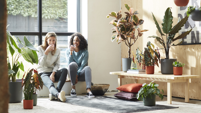 Många traditionella höstfärger ger en varm känsla som de är: rött och orange, gult och mörkgrönt. Dessa färger fungerar också bra när du försöker skapa en känsla av brittsommar. Tänk bara på en tidig solnedgång som går i rött och djupt orange och som lyser upp dig och din medarbetare när ni tar en drink på en uteplats vid vattnet och pratar om sommaren som varit. Du kan återskapa den här känslan i din trädgård eller på din balkong med de nya tegelstensfärgade elho loft-produkterna. Kombinera de mjuka, rödbruna blomlådorna och krukorna med växter som är gröna och färggranna under hösten, som ljung, bambu eller aukuba. Det fina är att du kan skapa samma känsla inomhus med den nya blomkrukan elho b. for soft round i samma färg. Lägg till några tropiska växter för att verkligen få till den där varma sensommarkänslan.