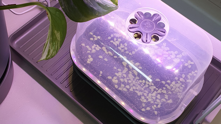 The plants need about 8 weeks to grow big enough before they can go outside and be planted in a pot. For sowing, I use the grow house combined with the grow tray and a grow tray saucer underneath. Make sure to use the appropriate soil for seedlings and water the seeds with a plant sprayer after sowing.