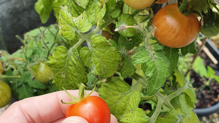 Unfortunately, we don’t all live in a climate where it’s warm all year round, so we can only expect a tomato harvest in the months of August, September, and October. After October, the tomatoes will no longer develop colour. The big advantage of tomatoes grown in pots is that after October, you can still bring them inside so that they can continue developing their lovely colours. After that, it’s best to empty the pots, clean them, and store them for the next season.
