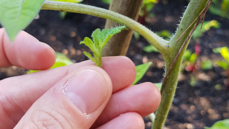 This is the removal of the axillary shoots that arise on the main stem and side branches of the plant. If you don’t remove them, the plant will use up a lot of energy in growing new leaves instead of new flowers. The flowers will eventually become tomatoes that you can harvest. Make sure to check for these shoots every week, and if you see any, break them off with your thumb and index finger.