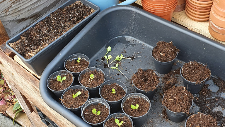 Repot the seedlings when they’ve grown 4 leaves. You’ll notice that the plants are bigger, and perhaps you’ll even see the leaves starting to turn a lighter colour. This indicates that the nutrients in the soil have been used up and that the plants need a different home. Take some small cultivation pots and use universal potting soil to transfer the plants. Carefully remove the seedlings from the seedling tray without damaging the roots and transplant them. Lightly press the soil around them and water with a small watering can.