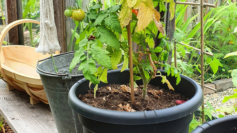 If you’ve opted for a large plant variety, you top the plants as soon as they grow higher than the rings of the tomato pot. By breaking off the top, you encourage the plant to use available nutrients to develop the fruit instead of creating new leaves.